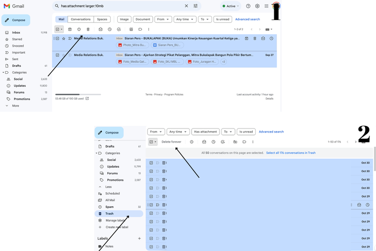 Setelah menemukan berbagai file besar dengan ukuran yang diinginkan,maka klik tanda centang di sebelah kiri dan hapus seluruh e-mail. Hapus e-mail dengan mengeklik ikon sampah di bagian menu bar atas.