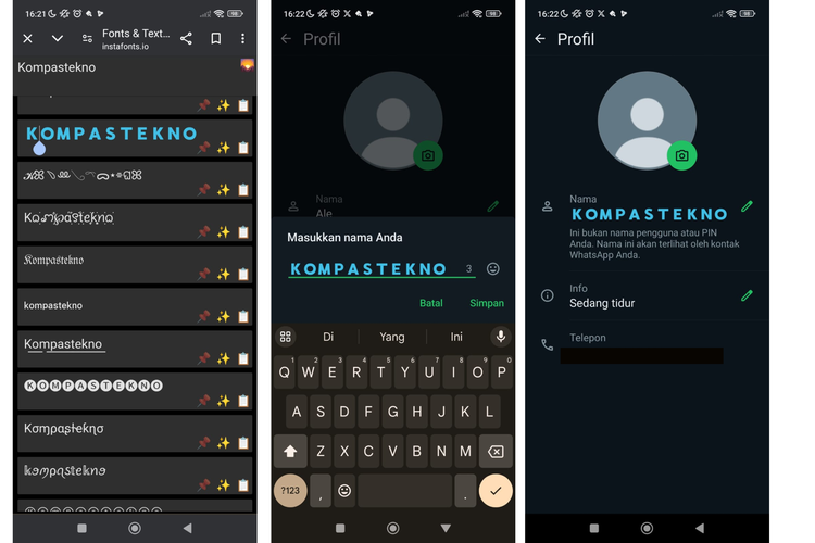Namun baik Anda dan pengguna lain masih dapat melihat perubahan model nama WhatsApp yang berubah. Misalnya saja Anda mengubah nama WhatsApp dengan gaya huruf unik dari situs instafonts.io.