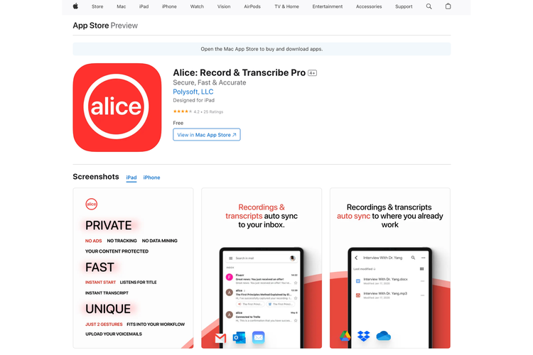 Alice adalah aplikasi sulih suara gratis yang biasanya banyak digunakan oleh jurnalis. Fokus utamanya adalah transkripsi. Ini memberikan kemudahan pengguna untuk merekam percakapan apa pun.