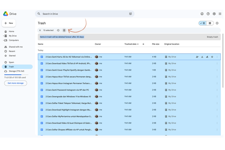 Nantinya file-file Google Docs yang sudah terhapus akan masuk ke dalam folder sampah dan tidak akan terhapus permanen selama 30 hari. Maka dari itu bagi Anda yang ingin segera membersihkan penyimpanan Google Drive,dapat menghapus file-file secara permanen di folder sampah.