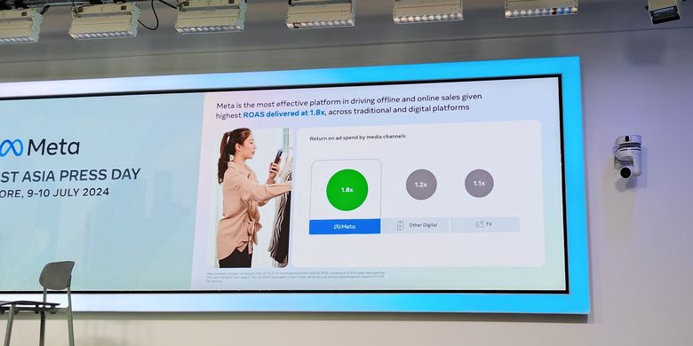 KOMPAS.com/Bill Clinten Salah satu hasil riset Kantar dan Meta yang mengeklaim platform Meta bisa bikin pengeluaran iklan balik modal hingga 1,8 kali lipat,dipresentasikan di Meta Southeast Asia Press Day di kantor Meta di Singapura,Selasa (9/7/2024).