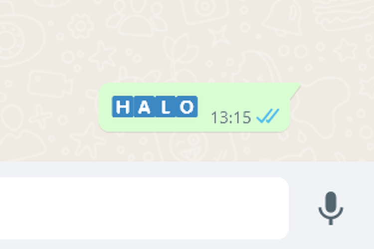 Pengguna nantinya juga bisa memakai tulisan biru di WhatsApp untuk menguatkan pesan pada kata-kata tertentu. Adapun contoh tulisan biru di WhatsApp adalah sebagaimana yang tertera pada gambar di bawah ini.