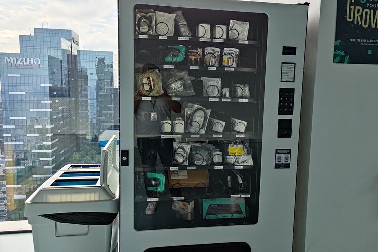 "Karyawan bisa menggunakan kartu ID mereka untuk mengambil satu atau beberapa periferal komputer,seperti headset,kabel HDMI,mouse,keyboard,dan lain sebagainya secara gratis melalui vending machine ini," ujar pemandu kepada KompasTekno.