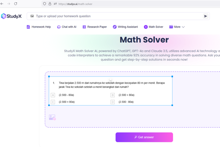 Untuk matematika,StudyX mengeklaim bisa menjawab soal-soal,seperti persamaan dan pertidaksamaan aljabar,bangun ruang,trigonometri,statistik,dan peluang. Penyelesaian matematika StudyX didukung dengan model ChatGPT,GPT-4o,dan Claude 3.5.
