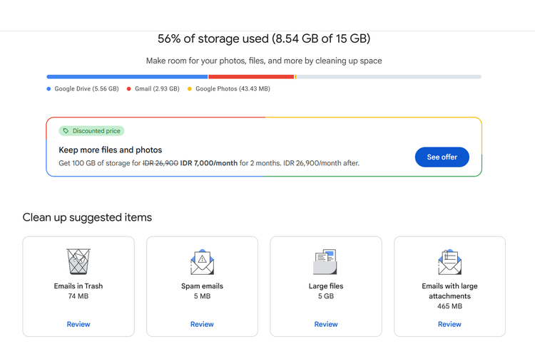 Sebagai informasi,setiap akun Google bakal memperoleh ruang penyimpanan berbasis Cloud atau Google One sebesar 15 GB secara gratis. Google One dipakai untuk menyimpan data pada Google Drive,dan Gmail secara terintegrasi.