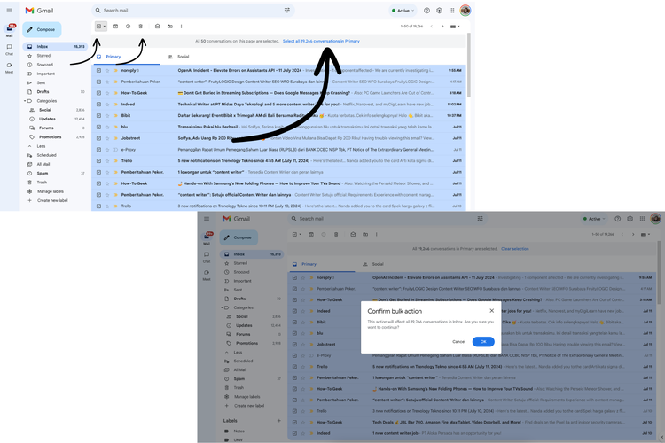 Kemudian pilih “Select all (jumlah e-mail yang masuhk di kotak masuk) conversations in Primary”