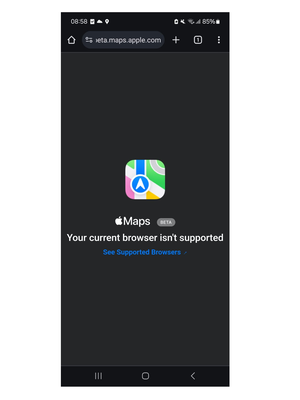 Saat membuka Apple Maps versi web di browser Mozilla Firefox versi PC,atau Google Chrome di smartphone Android,KompasTekno disambut dengan teks "Your current browser isn't supported" (Peramban yang anda gunakan tidak didukung).