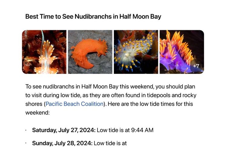 Salah satunya ketika pengguna menelusuri tentang waktu yang pas untuk melihat Nudibranch di Half Moon Bay,AS. Nudibranch atau lebih dikenal Nudi,yaitu salah satu jenis siput laut yang tidak memiliki cangkang.