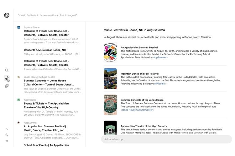 Contoh lainnya yaitu ketika pengguna menelusur festival musik di Boone,North Carolina untuk bulan Agustus 2024. SearchGPT kemudian menampilkan hasil penelusuran secara real-time,termasuk tautan ke sumber informasi. Hasilnya seperti gambar di bawah ini.