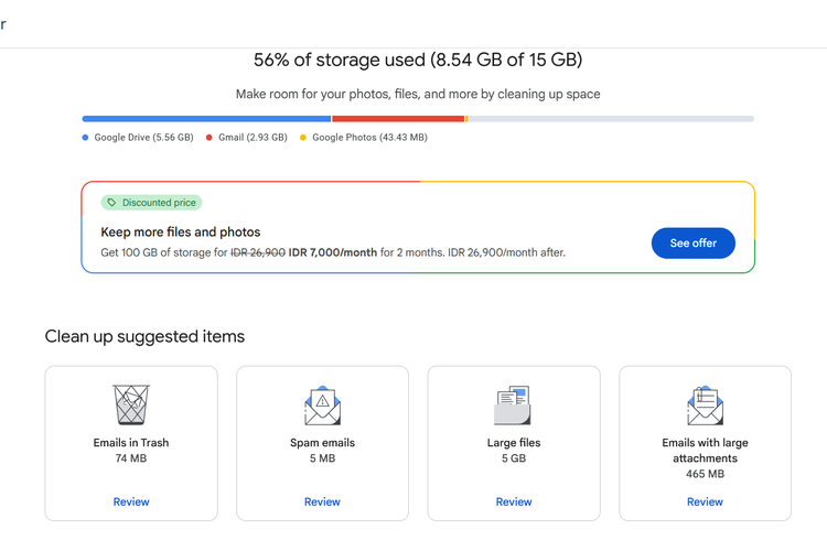 Penyimpanan Google Drive juga bisa penuh lantaran banyak e-mail di Gmail dan foto di Google Photos yang menumpuk. Sebagai informasi,penyimpanan Google Drive sejatinya terintegrasi dengan layanan penyimpanan Google atau Google One.