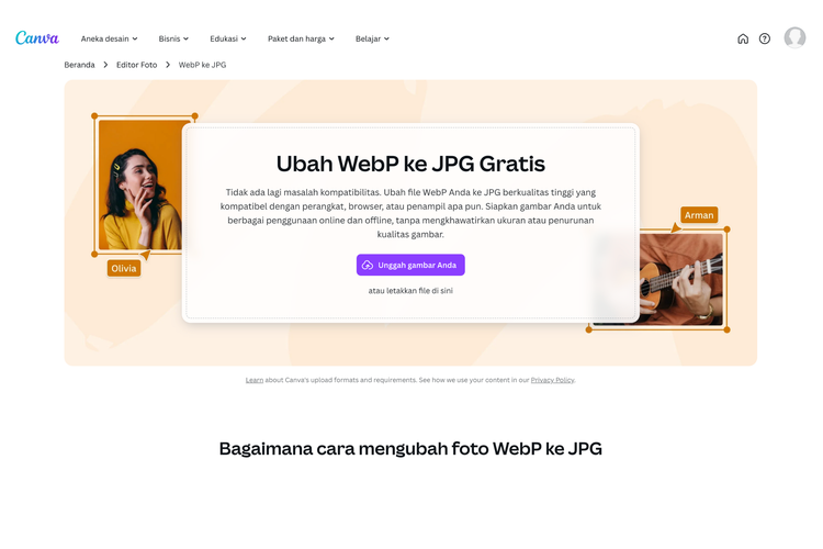 Meskipun efisien,format ini belum sepenuhnya didukung oleh semua platform dan perangkat,sehingga mengonversinya ke format JPG yang lebih umum bisa sangat berguna. Mengonversi gambar format WebP ke JPG dapat dilakukan dengan mudah dan cepat melalui beberapa platform ketiga. Salah satunya melalui Canva.