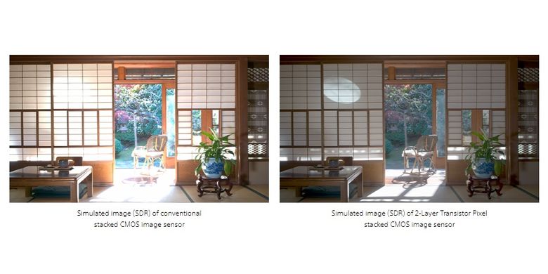 Sony Sony mengeklaim sensor berteknologi 2-Layer Transistor Pixel mampu menangkap rentang dynamic range (SDR) lebih luas (kanan) dibandingkan sensor stacked CMOS konvensional