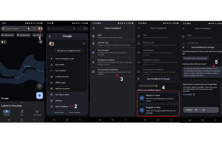 Cara melaporkan konten penipuan di mobile bisa dilakukan dengan membuka aplikasi Google Maps,mengetuk foto profil di kanan atas halaman,kemudian memilih menu "Help & feedback" (Bantuan dan saran).