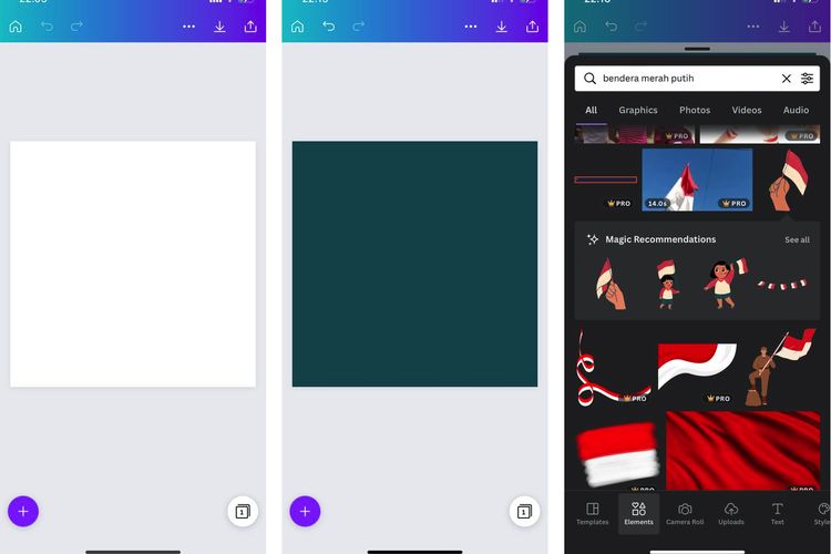 Bila background telah selesai dibuat dengan menambahkan beberapa elemen,silakan tambahkan bidang bingkai foto. Caranya,klik ikon tambah dan pilih opsi “Elemen”,lalu cari dan pilih bidang bingkai sesuai kebutuhan.