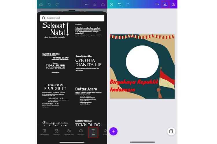 Selanjutnya,pengguna bisa menambahkan teks ke desain Twibbon yang dibuat dengan cara klik ikon tambah dan pilih opsi “Teks”.