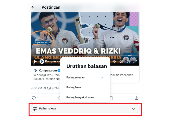 rolling out now: sort replies on any post by most relevant,recent,or liked pic.twitter.com/bBjaRliUxZ— X (@X) August 9,2024Fitur ini baru tersedia di aplikasi mobile versi iOS dan X versi web. Berdasarkan pantauan KompasTekno,fitur ini sudah muncul di X versi web di Indonesia. Semua pengguna,baik yang berlangganan X Premium maupun tidak,bisa menikmati fitur anyar ini.Fitur baru ini sangat berguna bagi pengguna X/Twitter untuk lebih mengontrol reply yang ingin dilihat. Dengan demikian,mereka bisa menyaring jawaban-jawaban yang tidak relevan,bahkan cenderung spam,seperti posting jualan atau promosi yang menyelip di antara jawaban.[b]Baca juga: X/Twitter Tutup Kantor Pusat Legendaris di San FranciscoAkan tetapi,pengaturan filter reply ini harus diatur secara manual per posting. Artinya,pengaturan yang sudah dipilih,akan ter-reset dan tidak akan tersimpan untuk melihat jawaban posting lainnya.Dengan begitu,pengguna harus mengatur ulang saat ingin menyortir tampilan replies di posting lain.Simak breaking news[/b] dan berita pilihan kami langsung di ponselmu. Pilih saluran andalanmu akses berita Kompas.com WhatsApp Channel : https://www.whatsapp.com/channel/0029VaFPbedBPzjZrk13HO3D. Pastikan kamu sudah install aplikasi WhatsApp ya.