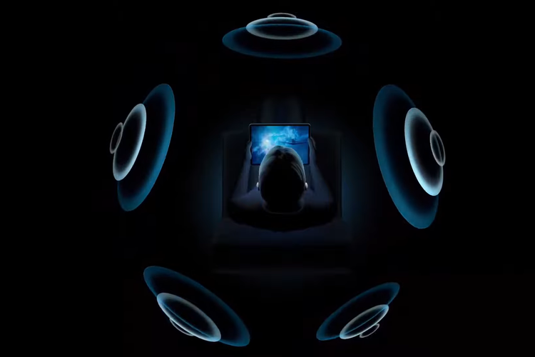 Apple Ilustrasi fitur Spatial Audio,yang mampu menghasilkan audio dari berbagai arah,sehingga membuat suara seolah-olah berada di sekitar pengguna.