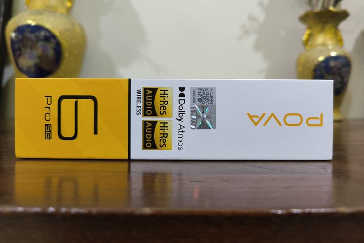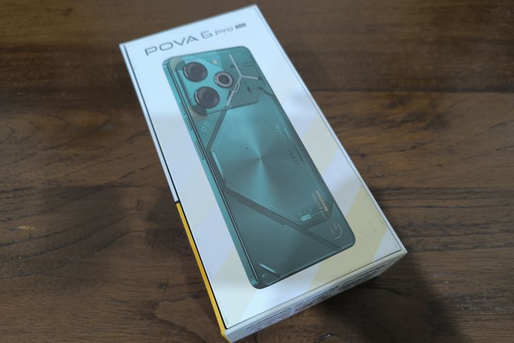 KOMPAS.com/Mikhaangelo Fabialdi Nurhapy Beralih ke bagian punggung boks,yang dilengkapi teks Pova 6 Pro 5G.