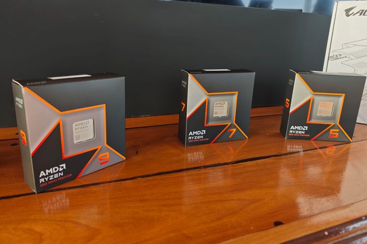 KOMPAS.com/Oik Yusuf Beberapa prosesor AMD Ryzen 9000 Series yang dipanjang dalam acara peluncurannya di Jakarta,Rabu (21/8/2024)