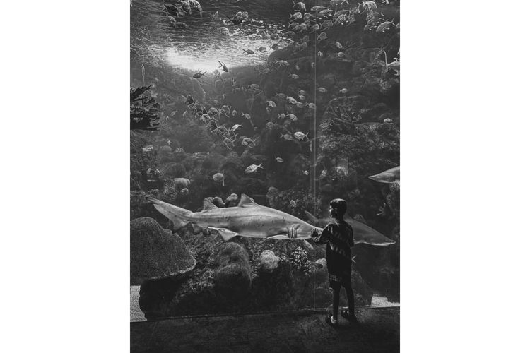 Foto Erin menampilkan seorang anak kecil yang sedang berdiri di depan akuarium sembari menempelkan telapak tangannya ke kaca akuarium. Menariknya,posisi tangan anak kecil tersebut berada tepat di bagian muka ikan hiu yang sedang berenang.