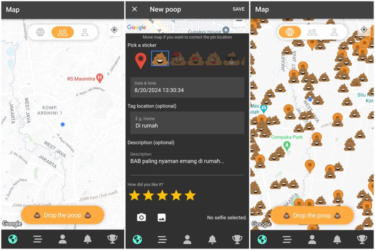 Masih di laman utama aplikasi,di sini juga ada tombol "Drop the poop" yang memungkinkan pengguna menandai titik mereka saat ini dengan ikon "BAB". Ini berarti pengguna sudah pernah BAB di tempat atau titik tersebut.
