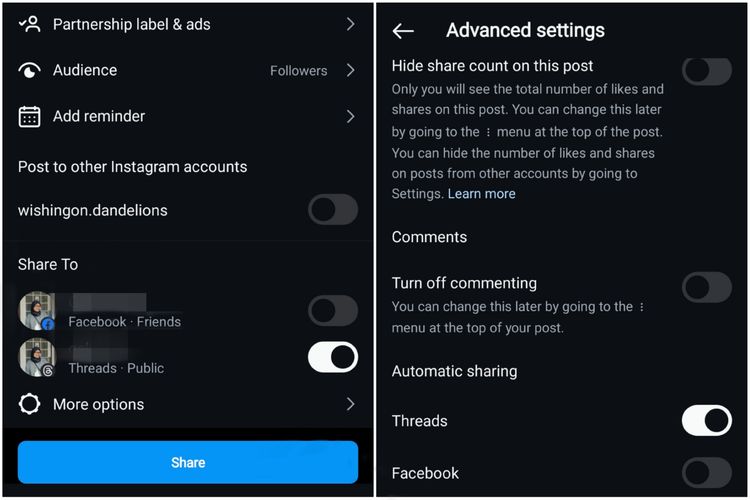 Pengguna Instagram memiliki dua opsi untuk cross-posting ke Threads,yakni secara manual atau secara otomatis.