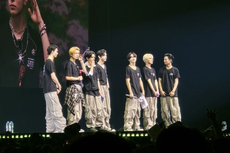 KOMPAS.com/Caroline Saskia Tanoto Grup band EnHypen yang tengah berinteraksi dengan penonton di atas panggung di konser hari pertama ENHYPEN World Tour: Fate Plus in Jakarta