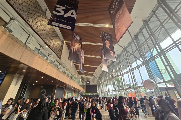 KOMPAS.com/Caroline Saskia Tanoto Suasana Hall 3 di ICE BSD yang dipenuhi dengan banner dan dekorasi grup band EnHypen