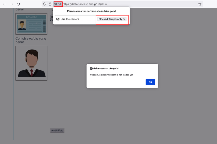 Saat hendak swafoto di SSCASN dan muncul pesan “Webcam.js Error Webcam is not loaded yet”,klik ikon kamera yang berada di sebelah kiri kolom URL.
