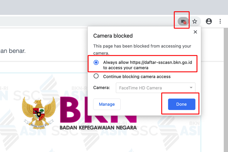Selanjutnya,pilih opsi “Always allow (nama website) to access your camera” dan klik “Done”.