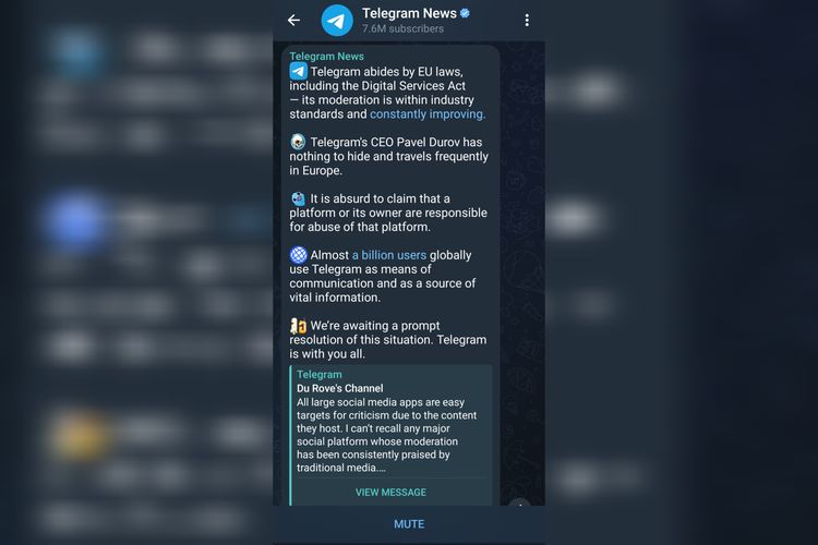 "Semua operasi kami di Telegram mematuhi hukum-hukum yang berlaku di wilayah Eropa,termasuk Undang-Undang Layanan Digital yang berlaku di sana. Selain itu,proses moderasi konten kami juga berevolusi seiring berjalannya waktu," klaim Telegram.