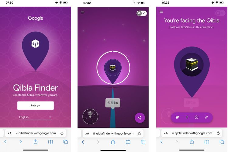Berikutnya,klik opsi “Let’s go” untuk memulai pemindaian arah kiblat sesuai lokasi pengguna berada.