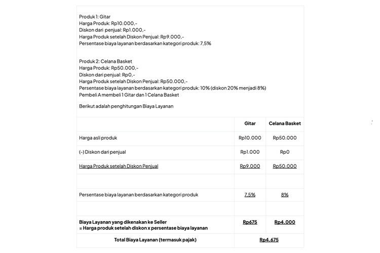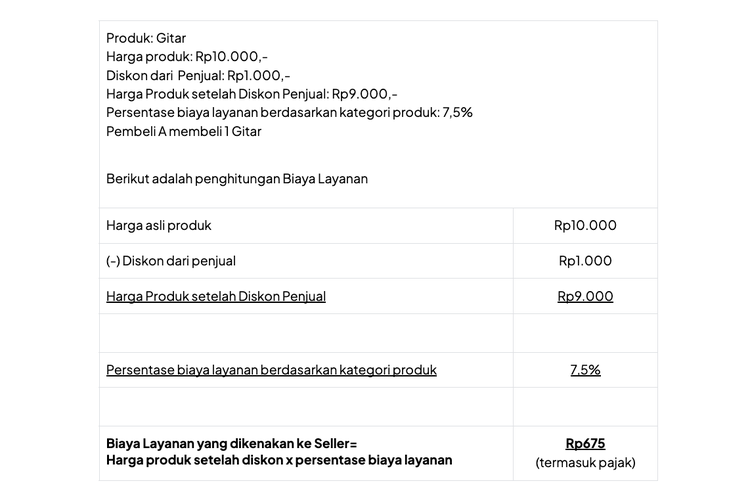 Rumus perhitungan:Biaya layanan = (Harga per produk - Diskon Penjual) x Persentase biaya layanan berdasarkan kategori produk.
