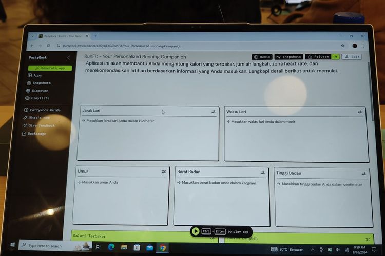 Selanjutnya,PartyRock akan membuat aplikasi AI yang menerima beberapa prompt,seperti Jarak Lari,Waktu Lari,Umur,Berat Badan,dan lain sebagainya untuk mengecek performa dan rekomendasi latihan lari bagi pengguna.