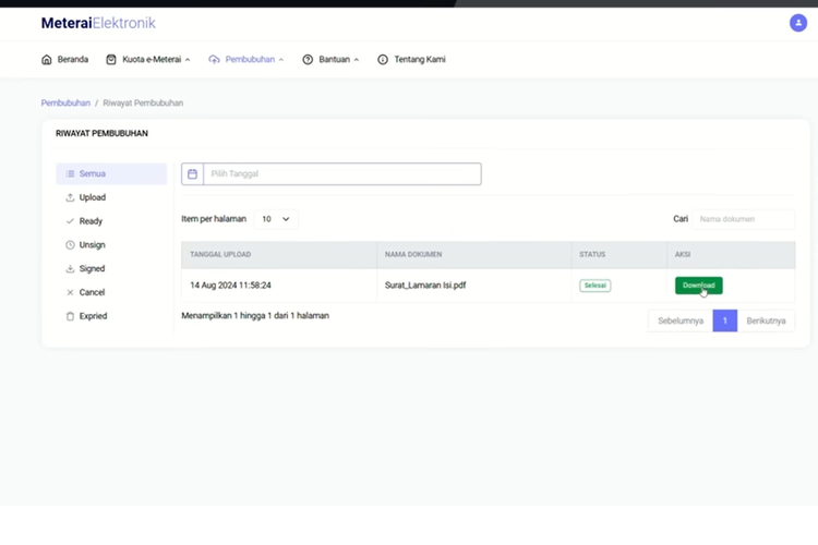 Selanjutnya,proses pemasangan e-meterai di dokumen akan berjalan. Jika sudah selesai,klik opsi “Download” buat mengunduh dokumen CPNS 2024 yang telah dibubuhi e-meterai.