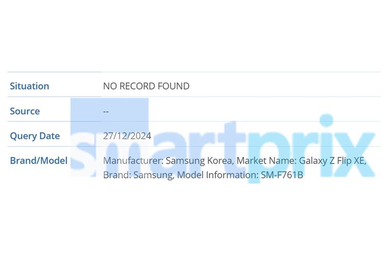 Perangkat ini juga sudah muncul di database GSMA yang mencatat nama perangkat “Galaxy Z Flip XE” dengan nomor model SM-F76FB. Pendaftaran nama model tersebut dilakukan pada 27 Desember 2024.