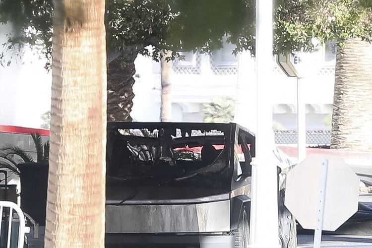 AFP/WADE VANDERVORT Bangkai mobil Tesla Cybertruck yang meledak di luar hotel milik presiden terpilih Amerika Serikat,Donald Trump,di Las Vegas pada 1 Januari 2025.