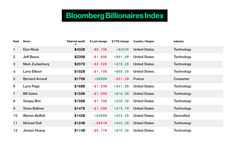 Bloomberg Billionaires Index Daftar bos-bos teknologi dunia yang makin kaya pada 2024,dan total kekayaan bersihnya.