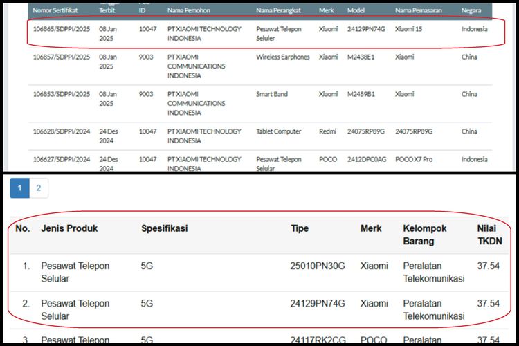 Kompas.com/BILL CLINTEN Ilustrasi Xiaomi 15 yang sudah muncul di laman Postel SDPPI Kemkomdig (atas) dan TKDN Kemenperin (bawah).
