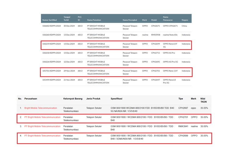 Pantauan KompasTekno,Rabu (8/1/2025),Oppo Reno 13F 4G dan Reno 13F 5G terdaftar dalam dua sertifikat berbeda,tapi sama-sama diajukan oleh PT Bright Mobile Telecommunication.