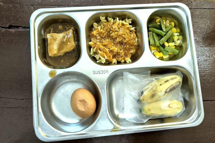 Menu makan bergizi gratis yang dibagikan hari ini hanya berisimakaroni bolognese,tahu semur,sayur capcay,telur rebus,dan dua buah pisang.
