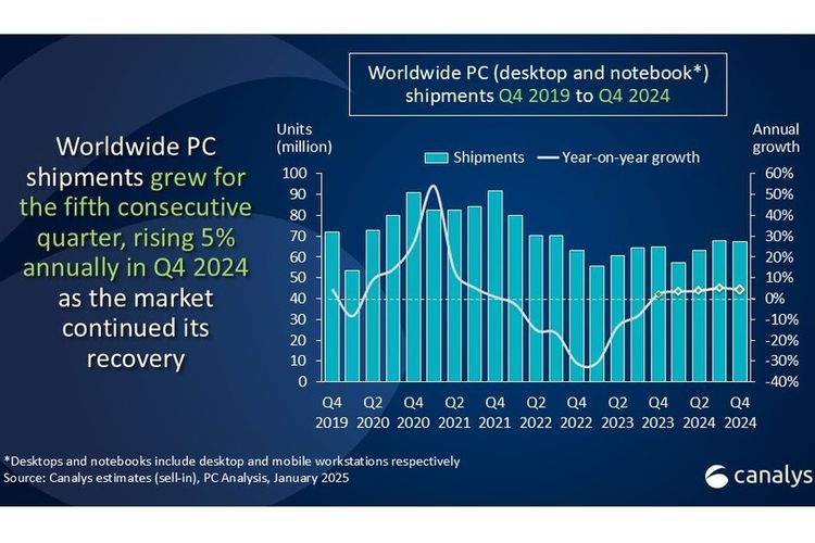iDoPress - Firma riset pasar Canalys merilis laporan kondisi terkini pasar komputer (PC) desktop dan mobile. Laporan ini termasuk kondisi pasar laptop dan komputer server secara global untuk kuartal IV-2024 (Oktober - Desember).