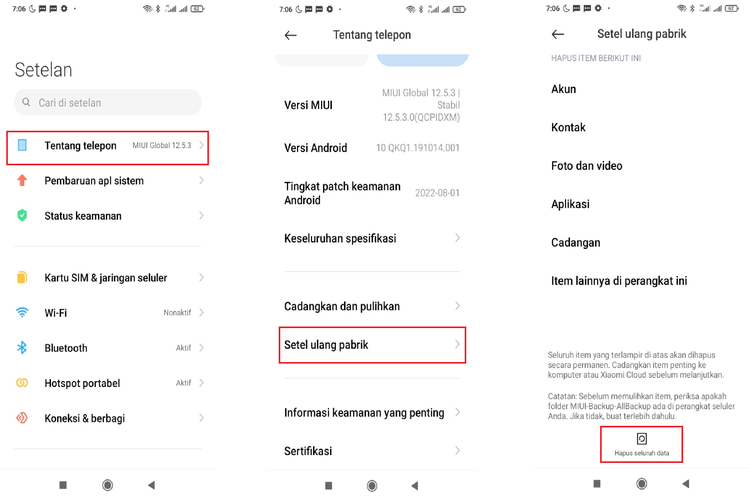 Pengguna bakal disajikan dengan informasi data dan pengaturan apa saja yang akan dihapus. Pengguna juga disarankan untuk mencadangkan data dulu sebelum factory reset dimulai.