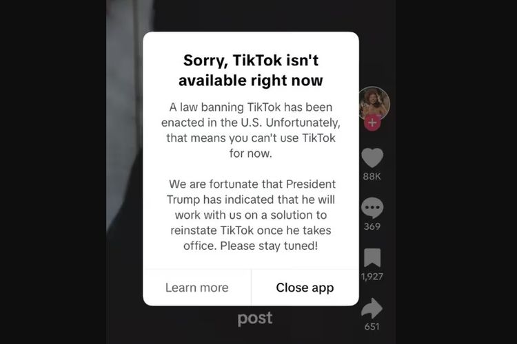 Meski demikian,aplikasi TikTok di Android dan iOS masih belum muncul. Kemungkinan hal ini masih berkaitan dengan penegakan UU larangan yang mulai berlaku 19 Januari.