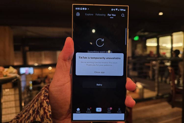 Sedikit berbeda dari sebelumnya,notifikasi yang muncul bertuliskan "TikTok is temporarily unavailable. We're working hard to resolve this issue. Thank you for your patience". (TikTok tidak tersedia untuk sementara. Kami sedang berupaya keras untuk mengatasi masalah ini. Terima kasih atas kesabaran Anda.)