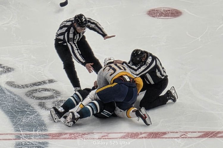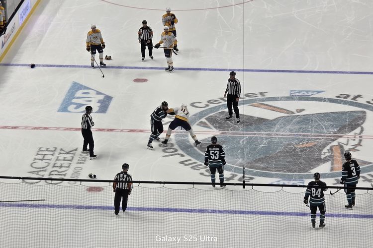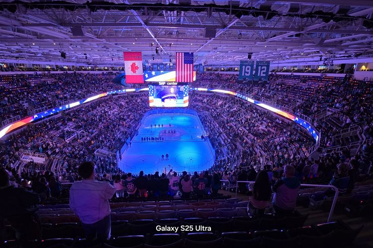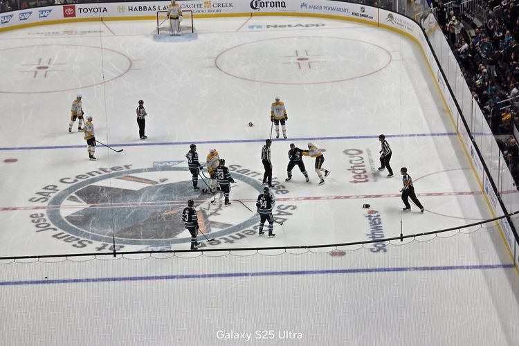 Kamera Galaxy S25 Ultra tersebut diuji kemampuannya untuk merekam pertandingan hoki es National Hockey League (NHL) atau ice hockey,antara tuan rumah San Jose Sharks lawan Nashville Predators di stadium SAP Center,San Jose,California,AS.