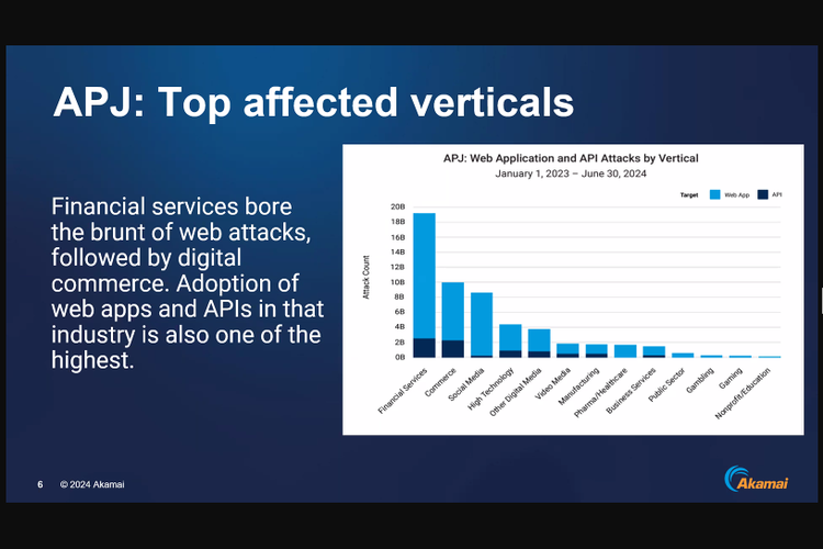 Layanan keuangan menjadi sektor yang paling banyak mengalami serangan siber di kawasan APJ. Totalnya mencapai lebih dari 18 miliar serangan selama periode 1 Januari 2023 hingga 30 Juni 2024.