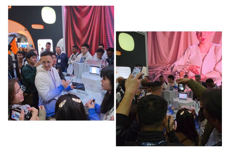 KOMPAS.com/ Galuh Putri Riyanto Suasana di area booth Tecno,tepatnya spot untuk memamerkan HP lipat tiga konseptual Tecno Phantom Ultimate 2. Banyak pengunjung rela berjubel dan mengantre untuk melihat langsung wujud Tecno Phantom Ultimate 2 ini.