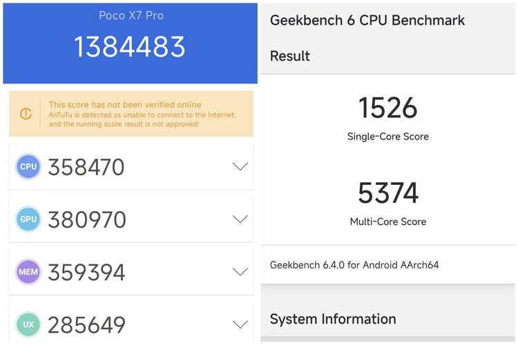 Lalu pada benchmark Geekbench (v6),Poco X7 Pro mendapatkan skor performa single core mencapai 1.526 poin serta multi core 5.374 poin,lebih tinggi dari beberapa ponse mid-range yang ada di pasar.