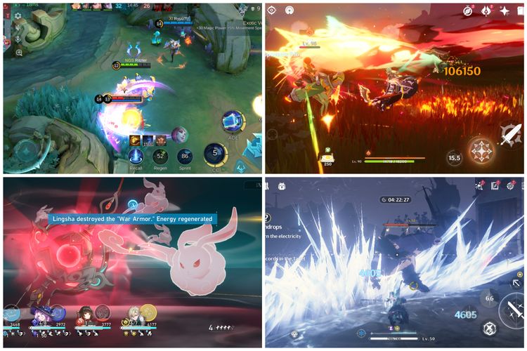 Kompas.com/BILL CLINTEN Pengalaman bermain game Mobile Legends (kiri atas),Genshin Impact (kanan atas),Honkai Star Rail (kiri bawah),dan Wuthering Waves (kanan bawah) di Poco X7 Pro.